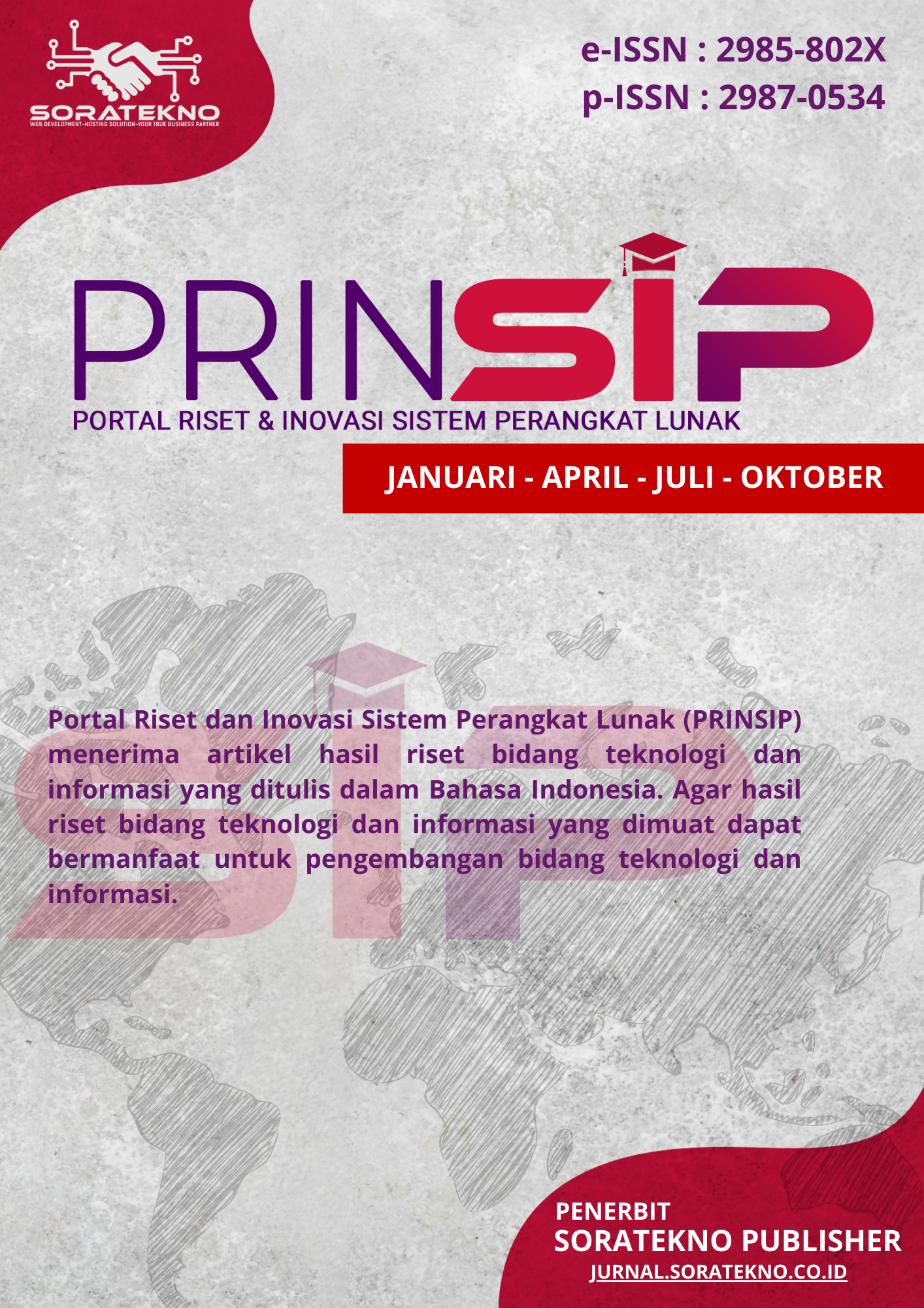 Portal Riset dan Inovasi Sistem Perangkat Lunak (Prinsip) merupakan jurnal nasional yang diterbitkan oleh Soratekno Publisher secara berkala (satu tahun 4 kali yaitu Januari, April, Juli Dan Oktober) dengan tujuan untuk menyebarluaskan hasil riset bidang teknologi dan informasi kepada para akademisi, praktisi, mahasiswa, dan lain-lain. Portal Riset dan Inovasi Sistem Perangkat Lunak (Prinsip) menerima kiriman artikel hasil riset bidang teknologi dan informasi yang ditulis dalam Bahasa Indonesia. Agar hasil riset bidang teknologi dan informasi yang dimuat dapat bermanfaat untuk pengembangan bidang teknologi dan informasi.